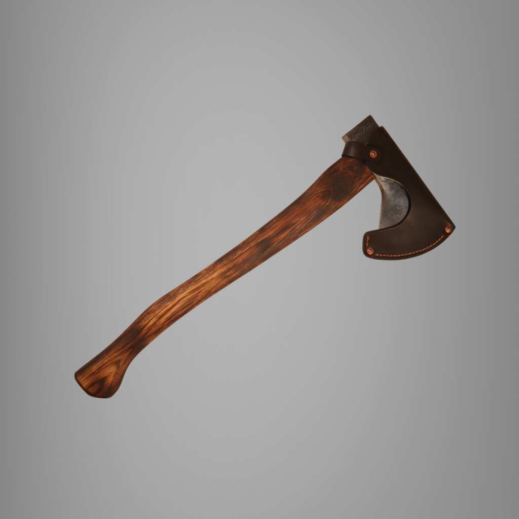 The hickory handle is custom-finished with a light stain + burn treatment, then sealed with linseed oil and axe wax for durable protection and confident grip. Includes a handmade, full-grain leather edge cover by Dry Fly Leather Goods—ready for the field, and worthy of display.